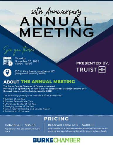 The Burke County Chamber of Commerce Annual Meeting is an opportunity to reflect on and celebrate the accomplishments over the past year, as well as look forward to 2026! Lunch will be served. This event will include a guest speaker.