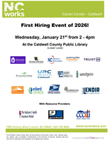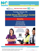 Mark your calendars for the NC Department of Adult Correction recruiting event scheduled for Thursday, February 19th from 9:00 am to 4:00 pm at the Collett Street Recreation Center located at 300 Collett St, Morganton, NC 28655. They will be hiring for multiple vacancies for different types of positions. Please see the attached flyer for more details.